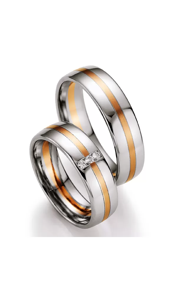 Zlaté snubní prsteny vyrobeny v kombinaci bílého a růžového čtrnáctikarátového zlata - 585/000 v mírném půlkulatém profilu v povrchové úpravě sametový mat na střední části - kraje lesklé oddělené jemnými rýhami. V dámském prstenu jsou vsazeny tři kulaté diamanty briliantového brusu. Diamanty oplývají svou krásou a vlastnostmi, které jsou oproti jiným kamenům bezkonkurenční. Je to nejtvrdší nerost, který nikdy neztratí svou hodnotu. Diamant je král všech drahokamů a tedy i jedním z nejcennějších a proto se vyplatí do šperků s diamanty investovat a především u snubních prstenů, které jsou na celý život! Vsazování diamantů provádějí naši nejzkušenější mistři zlatníci ručně pod mikroskopem s přesností na 0,01mm a proto nehrozí vypadnutí kamínků jako to bývá u strojně vyráběných snubních prstenů. Snubní prsteny mají vnitřní fit profil - zaoblení vnitřní strany prstenů.