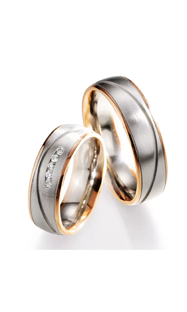 Zlaté snubní prsteny vyrobeny v kombinaci  bílého a růžového čtrnáctikarátového zlata - 585/000 v půlkulatém profilu v povrchové úpravě sametový mat na střední části s matnou vlnovkou - kraje lesklé oddělené jemnými rýhami. V dámském prstenu je vsazeno pět kulatých diamantů briliantového brusu. Diamanty oplývají svou krásou a vlastnostmi, které jsou oproti jiným kamenům bezkonkurenční. Je to nejtvrdší nerost, který nikdy neztratí svou hodnotu. Diamant je král všech drahokamů a tedy i jedním z nejcennějších a proto se vyplatí do šperků s diamanty investovat a především u snubních prstenů, které jsou na celý život!  Vsazování diamantů provádějí naši nejzkušenější mistři zlatníci ručně pod mikroskopem s přesností na 0,01mm a proto nehrozí vypadnutí kamínků jako to bývá u strojně vyráběných snubních prstenů. Snubní prsteny mají vnitřní fit profil - zaoblení vnitřní strany prstenů.