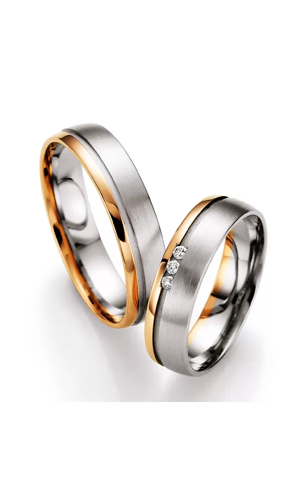 Zlaté snubní prsteny vyrobeny v kombinaci bílého a růžového čtrnáctikarátového zlata - 585/000 v půlkulatém profilu v povrchové úpravě: bílé zlato sametově matné - růžové zlato lesklé oddělené rýhou. V dámském prstenu jsou vsazeny tři kulaté diamanty briliantového brusu. Diamanty oplývají svou krásou a vlastnostmi, které jsou oproti jiným kamenům bezkonkurenční. Je to nejtvrdší nerost, který nikdy neztratí svou hodnotu. Diamant je král všech drahokamů a tedy i jedním z nejcennějších a proto se vyplatí do šperků s diamanty investovat a především u snubních prstenů, které jsou na celý život! Vsazování diamantů provádějí naši nejzkušenější mistři zlatníci ručně pod mikroskopem s přesností na 0,01mm a proto nehrozí vypadnutí kamínků jako to bývá u strojně vyráběných snubních prstenů. Snubní prsteny mají vnitřní fit profil - zaoblení vnitřní strany prstenů.
