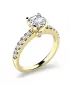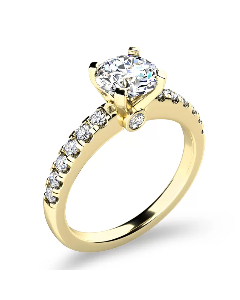 Tento zásnubní prsten je vyroben ze žlutého čtrnáctikarátového zlata - 585/1000 v lesklé povrchové úpravě. Prsten má jeden hlavní dominantní zirkon kulatého brusu, který je uchycený do čtyřkrapnové korunky. Toto uchycení pomůže zirkonu dokonale vyniknout jeho kráse a brusu. Krásným detailem je vsazení zirkonů i na boku korunky. Po stranách v obroučce prstenu je vsazeno na každé straně 6 zářivých zirkonů, které prsten zjemňují. Zásnubní prsten ohromí z každé strany. Všechny zirkony mají briliantový brus Signity star, který zajišťuje maximální brilanci kamenů. Díky skladbě a stylově čistému vsazení zirkonů, vyniká prsten krásnou brilancí kamenů. Vsazování zirkonů do zásnubních prstenů provádějí naši nejzkušenější mistři zlatníci ručně pod mikroskopem s přesností na 0,01mm a proto nehrozí vypadnutí kamínků jako to bývá u strojně vyráběných zásnubních prstenů.