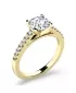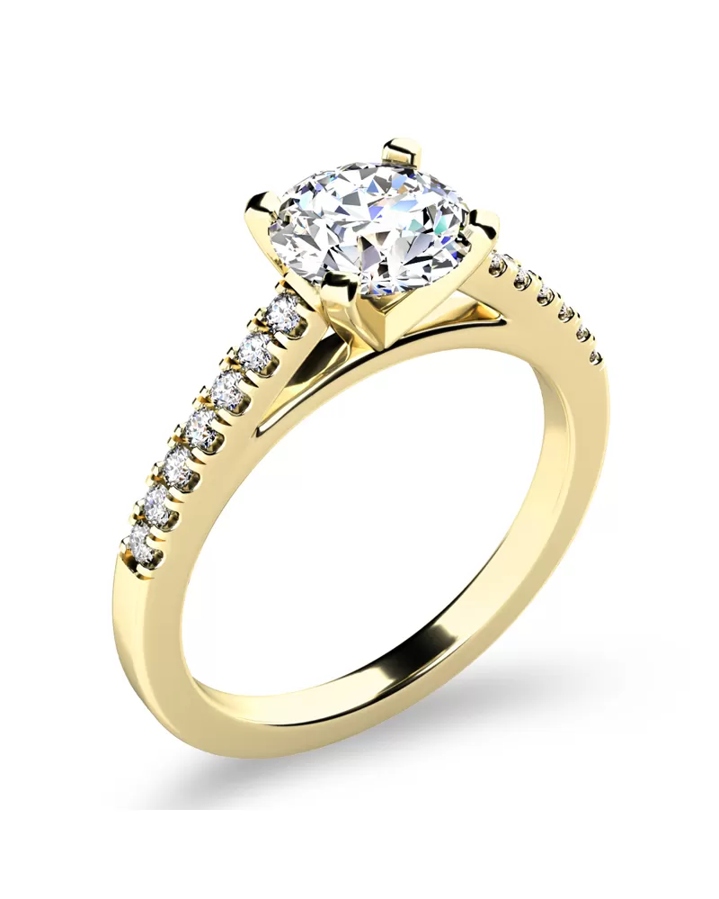 Zásnubní prsten je vyroben ze žlutého čtrnáctikarátového zlata - 585/1000 v lesklé povrchové úpravě. Prsten má jeden hlavní dominantní zirkon kulatého brusu, který je uchycený do čtyřkrapnové korunky. Toto uchycení nechá zirkon dokonale vyniknout v jeho kráse a brusu. Po stranách v obroučce prstenu je vsazeno na každé straně 7 zářivých zirkonů, které prsten zjemňují. Všechny zirkony mají briliantový brus Signity star, který zajišťuje maximální brilanci kamenů. Díky skladbě a stylově čistému vsazení zirkonů, vyniká prsten krásnou brilancí kamenů. Vsazování zirkonů do zásnubních prstenů provádějí naši nejzkušenější mistři zlatníci ručně pod mikroskopem s přesností na 0,01mm a proto nehrozí vypadnutí kamínků jako to bývá u strojně vyráběných zásnubních prstenů.