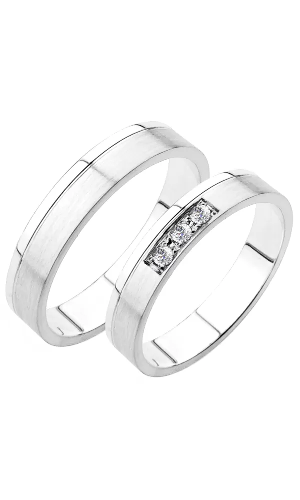 Elegantní snubní prsteny z bílého čtrnáctikarátového zlata 585/1000 rovného profilu s kombinovanou povrchovou úpravou lesk - sametový mat, který je oddělen lesklou rýhou. V dámském prstenu jsou vsazeny tři kulaté zirkony popř. diamanty briliantového brusu. Snubní prsteny je možné vyrobit v různých kombinací zlata, např. žluto-bílé nebo bílo-růžové. Samozřejmě je možné udělat širší proužek lesklý a užší proužek matný. Dále je možné snubní prsteny udělat užší - nižší cena nebo širší - vyšší cena.