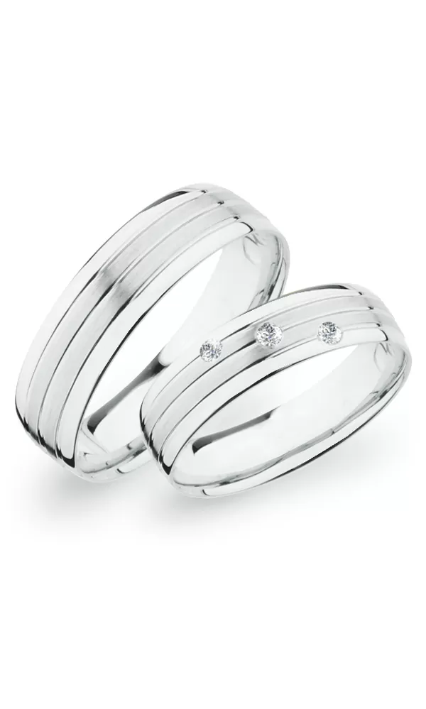 Snubní prsteny mírně půlkulatého profilu vyrobeny z bílého čtrnáctikarátového zlata 585/1000 s vnitřním fit profilem - zaoblení vnitřní strany pro příjemnější nošení s kombinovanou povrchovou úpravou lesk - sametový mat a se třemi lesklými rýhami po celém obvodě prstenů. V dámském prstenu jsou vsazeny tři kulaté zirkony s briliantovým brusem Signity star, který dodává zirkonům oslnivou brilanci. Do snubních prstenů si můžete nechat vsadit také diamanty. Kameny jsou vsazeny do prstenu "na hladko". Vsazování zirkonů i diamantů provádějí naši nejzkušenější mistři zlatníci ručně pod mikroskopem s přesností na 0,01mm a proto nehrozí vypadnutí kamínků jako to bývá u strojně vyráběných snubních prstenů. Snubní prsteny je možné vyrobit v různých barevných kombinacích zlata. Dále je možné snubní prsteny udělat např. užší - nižší cena nebo širší - vyšší cena.