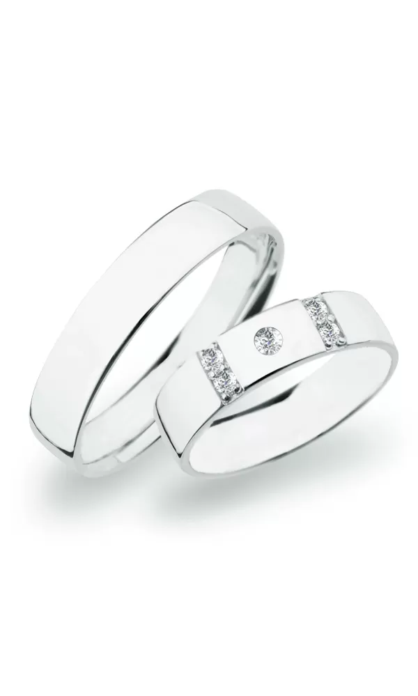 Snubní prsteny moderního designu v mírně půlkulatém profilu vyrobeny z bílého čtrnáctikarátového zlata 585/1000 v lesklé povrchové úpravě. Snubní prsteny mají vnitřní Fit Profil - půlkulatou vnitřní stranu pro příjemnější nošení, nasazování a sundavání. V dámském prstenu je vsazeno pět kulatých zirkonů popř. diamantů briliantového brusu.