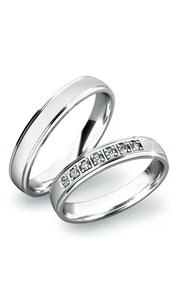 Snubní prsteny mírně půlkulatého profilu vyrobeny z bílého čtrnáctikarátového zlata 585/1000 v kombinaci lesklé a matné povrchové úpravy. Snubní prsteny mají vnitřní Fit Profil - půlkulatou vnitřní stranu pro příjemnější nošení, nasazování a sundavání. V dámském prstenu je vsazeno sedm kulatých zirkonů s briliantovým brusem Signity star, který dodává zirkonům oslnivou brilanci. Do snubních prstenů si můžete nechat vsadit také diamanty. Kameny jsou do prstenu vsazeny  "do krapniček". Vsazování zirkonů i diamantů provádějí naši nejzkušenější mistři zlatníci ručně pod mikroskopem s přesností na 0,01mm a proto nehrozí vypadnutí kamínků jako to bývá u strojně vyráběných snubních prstenů.