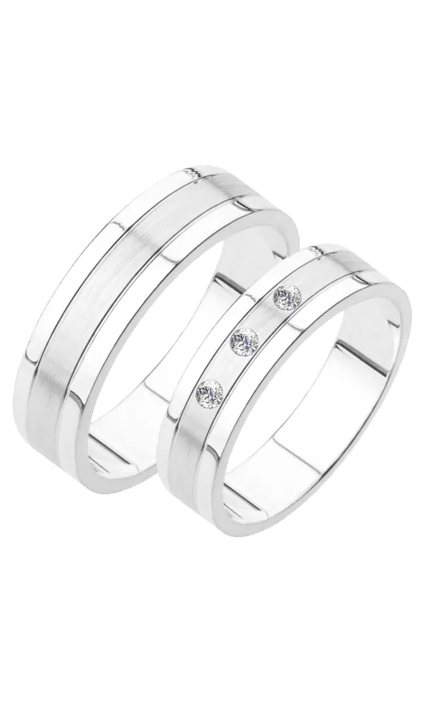 Zlaté snubní prsteny vyrobeny z bílého čtrnáctikarátového zlata 585/1000 v rovném profilu s kombinovanou povrchovou úpravou lesk - sametový mat, kdy matný proužek je zvýrazněm lesklými rýhami. V dámském prstenu jsou vsazeny tři kulaté zirkony popř. diamanty briliantového brusu. Snubní prsteny je možné vyrobit v různých šířkách např. 4,50mm a v různých povrchových úpravách a barevných variantách zlata.