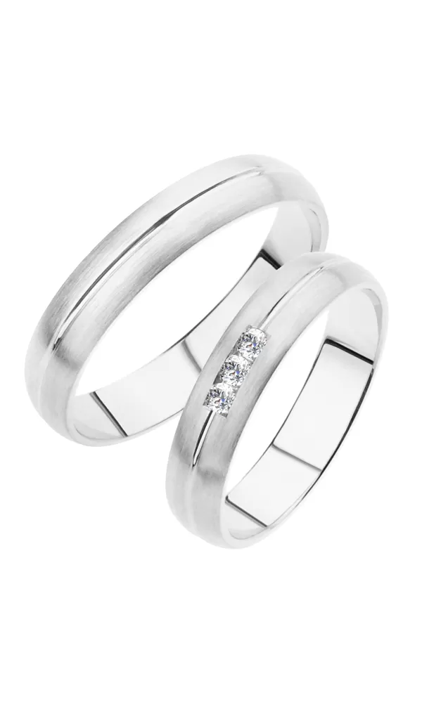 Elegantní vzor snubních prstenů půlkulatého profilu vyrobeny z bílého čtrnáctikarátového zlata 585/1000 s matnou povrchovou úpravou a lesklou rýhou. V dámském prstenu jsou vsazeny tři kulaté zirkony popř. diamanty briliantového brusu. Snubní prsteny je možné vyrobit v různých barevných kombinacích zlata a s libovolným počtem kamenů např. s pěti. Dále je možné snubní prsteny udělat užší - nižší cena nebo širší - vyšší cena.