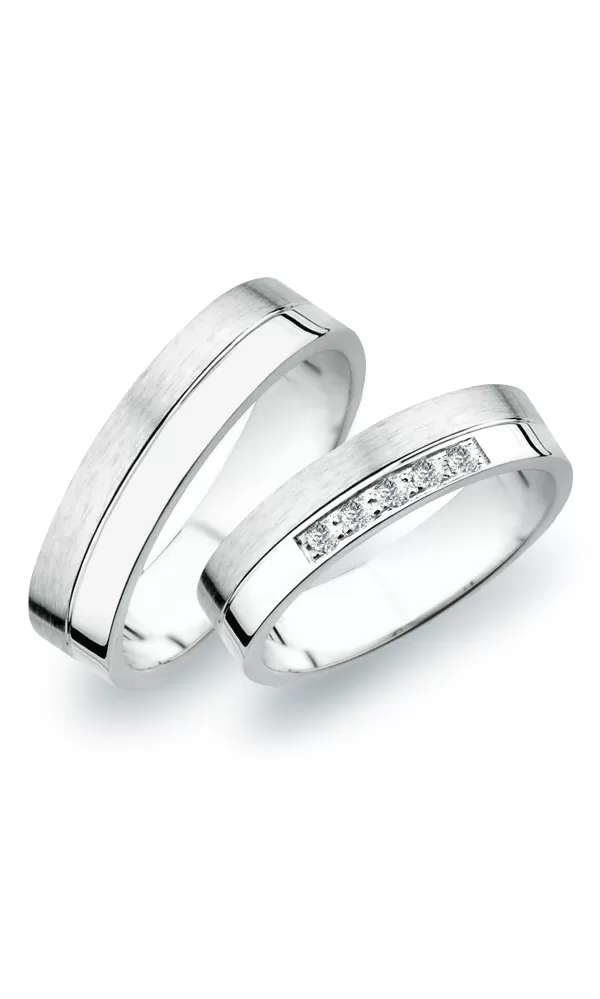 Snubní prsteny vyrobeny z bílého čtrnáctikarátového zlata 585/1000 rovného profilu s kombinovanou povrchovou úpravou lesk - sametový mat, který je oddělen jemnou lesklou rýhou. V dámském prstenu je vsazeno pět kulatých zirkonů s briliantovým brusem Signity star, který dodává zirkonům oslnivou brilanci. Do snubních prstenů si můžete nechat vsadit také diamanty. Kameny jsou vsazeny do zrnek. Vsazování zirkonů i diamantů provádějí naši nejzkušenější mistři zlatníci ručně pod mikroskopem s přesností na 0,01mm a proto nehrozí vypadnutí kamínků jako to bývá u strojně vyráběných snubních prstenů. Snubní prsteny je možné vyrobit v různých barevných kombinacích zlata a s libovolným počtem kamenů. Dále je možné snubní prsteny udělat užší - nižší cena nebo širší - vyšší cena.