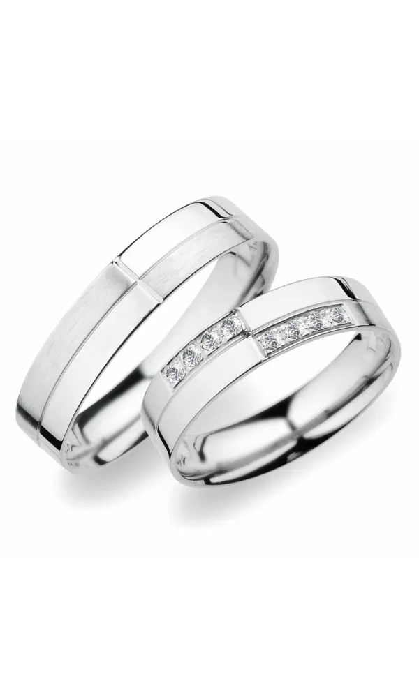Snubní prsteny vyrobeny z bílého čtrnáctikarátového zlata 585/1000 rovného profilu s vnitřním fit profilem - zaoblení vnitřní strany pro příjemnější nošení s kombinovanou povrchovou úpravou lesk - sametový mat, který je oddělen jemnou rýhou. V dámském prstenu je vsazeno osm kulatých zirkonů s briliantovým brusem Signity star, který dodává zirkonům oslnivou brilanci. Do snubních prstenů si můžete nechat vsadit také diamanty. Kameny jsou vsazeny do zrnek. Vsazování zirkonů i diamantů provádějí naši nejzkušenější mistři zlatníci ručně pod mikroskopem s přesností na 0,01mm a proto nehrozí vypadnutí kamínků jako to bývá u strojně vyráběných snubních prstenů.. Snubní prsteny je možné vyrobit v různých barevných kombinacích zlata a s libovolným počtem kamenů. Dále je možné snubní prsteny udělat užší - nižší cena nebo širší - vyšší cena.