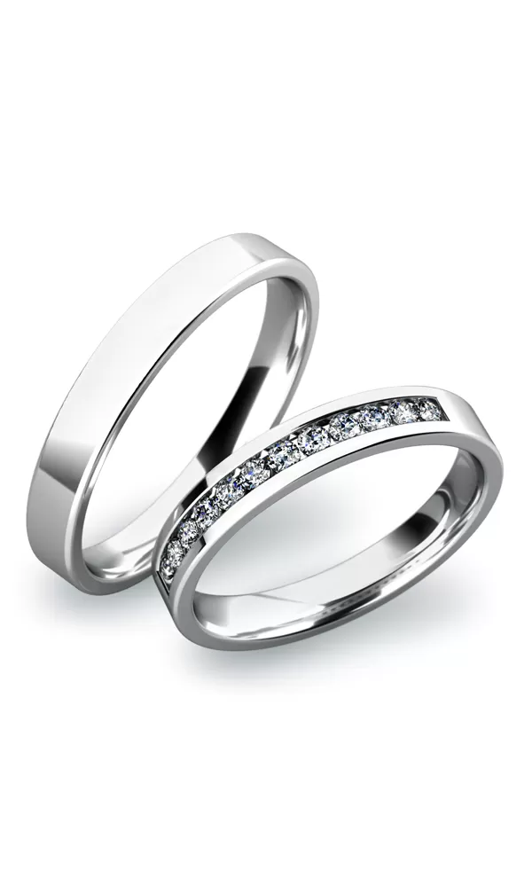 Krásné snubní prsteny v rovném profilu jsou vyrobeny z bílého čtrnáctikarátového zlata 585/1000 v lesklé povrchové úpravě. Snubní prsteny mají vnitřní Fit Profil - půlkulatou vnitřní stranu pro příjemnější nošení, nasazování a sundavání. V dámském prstenu je vsazeno dvanáct kulatých zirkonů s briliantovým brusem Signity star, který dodává zirkonům oslnivou brilanci. Do snubních prstenů si můžete nechat vsadit také diamanty. Kameny jsou do prstenu vsazeny "do krapniček". Vsazování zirkonů i diamantů provádějí naši nejzkušenější mistři zlatníci ručně pod mikroskopem s přesností na 0,01mm a proto nehrozí vypadnutí kamínků jako to bývá u strojně vyráběných snubních prstenů.