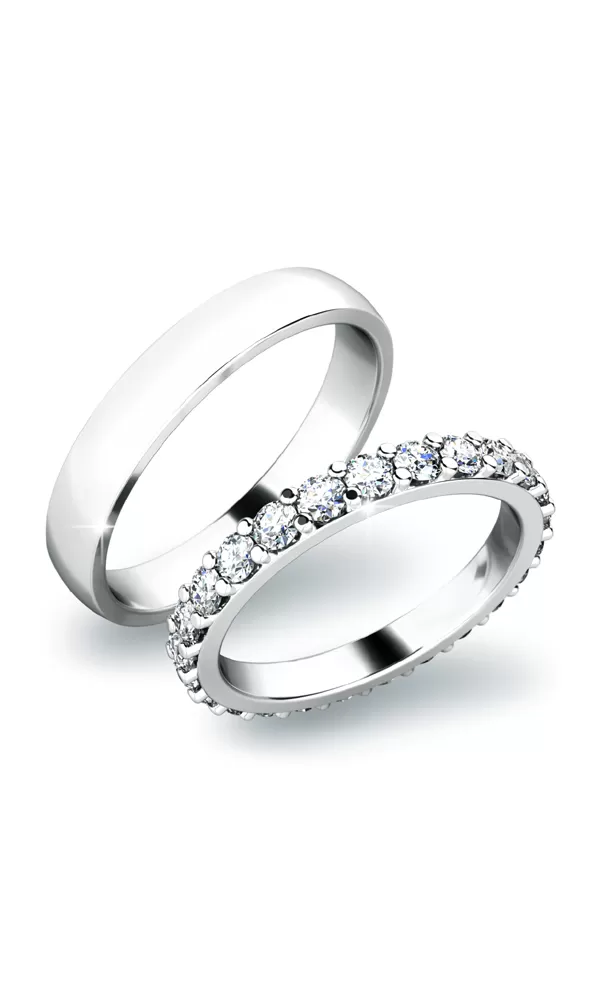 Nádherné snubní prsteny v mírně půlkulatém profilu jsou vyrobeny z bílého čtrnáctikarátového zlata 585/1000 v lesklé povrchové úpravě. Snubní prsteny mají vnitřní Fit Profil - půlkulatou vnitřní stranu pro příjemnější nošení, nasazování a sundavání. V dámském prstenu je vsazeno po celém obvodu dvacet pět kulatých zirkonů s briliantovým brusem Signity star, který dodává zirkonům oslnivou brilanci. Do snubních prstenů si můžete nechat vsadit také diamanty. Kameny jsou do prstenu vsazeny "do krapniček". Vsazování zirkonů i diamantů provádějí naši nejzkušenější mistři zlatníci ručně pod mikroskopem s přesností na 0,01mm a proto nehrozí vypadnutí kamínků jako to bývá u strojně vyráběných snubních prstenů.