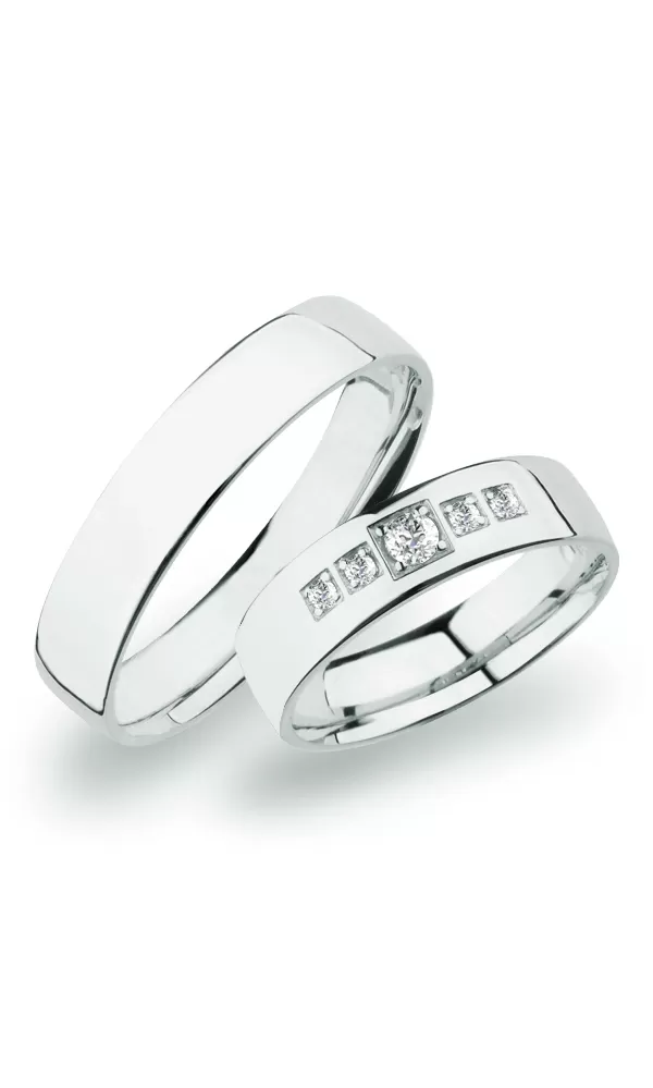 Snubní prsteny v mírně půlkulatém profilu vyrobeny z bílého čtrnáctikarátového zlata 585/1000 v lesklé povrchové úpravě. Snubní prsteny mají vnitřní Fit Profil - půlkulatou vnitřní stranu pro příjemnější nošení, nasazování a sundavání. V dámském prstenu je vsazeno pět kulatých zirkonů popř. diamantů briliantového brusu.