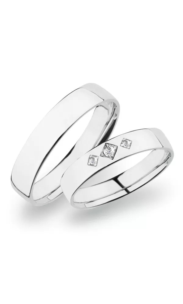 Snubní prsteny v mírně půlkulatém profilu vyrobeny z bílého čtrnáctikarátového zlata 585/1000 v lesklé povrchové úpravě. Snubní prsteny mají vnitřní Fit Profil - půlkulatou vnitřní stranu pro příjemnější nošení, nasazování a sundavání. V dámském prstenu jsou vsazeny tři kulaté zirkony popř. diamanty briliantového brusu.