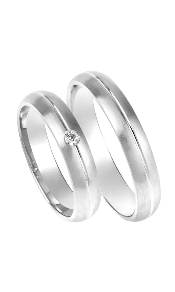 Zlaté snubní prsteny z bílého čtrnáctikarátového zlata 585/1000 půlkulatého profilu s matnou povrchovou úpravou a lesklou rýhou s jedním kulatým zirkonem popř diamantem briliantového brusu v dámském prstenu. Snubní prsteny je možné vyrobit v kombinované povrchové úpravě lesk - mat nebo celé lesklé. Také jsou možné kombinace žlutého a bílého popř. červeného zlata.