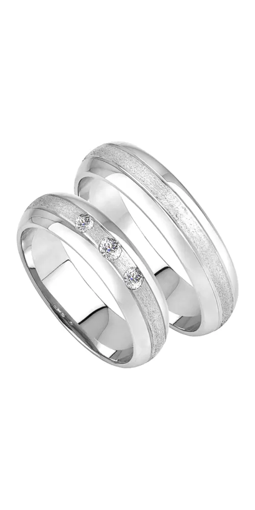 Zlaté snubní prsteny bílé zlato čtrnáct karátů 585/1000 půlkulatého profilu. Střední část je matná - diamantové broušení, kraje jsou lesklé oddělené lesklými jemnými rýhami. V dámském prstenu je vsazen jeden větší - středový a dva menší kulaté zirkony popř. diamanty briliantového brusu. Také jsou možné kombinace žlutého a bílého zlata.