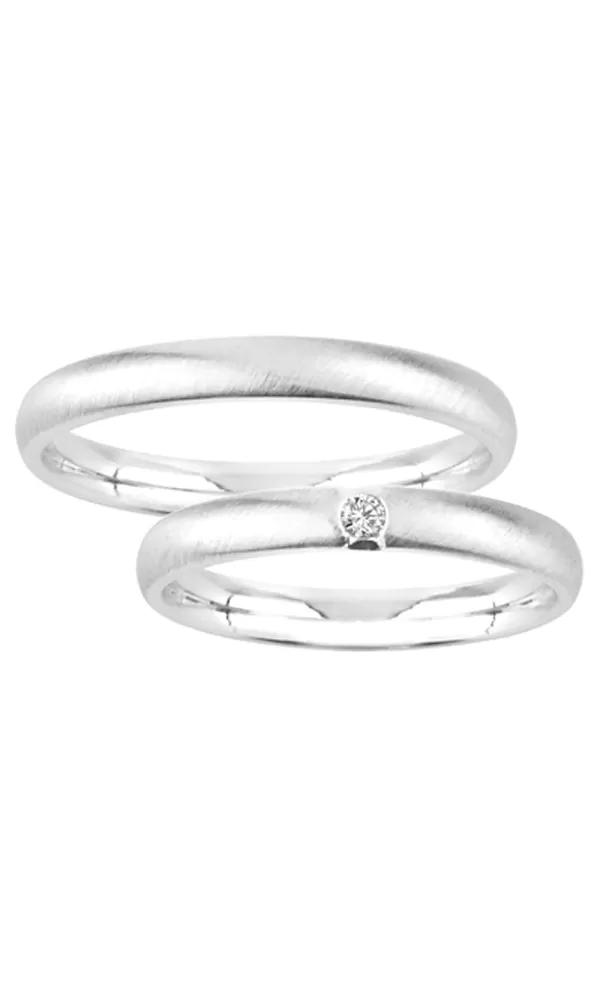 Snubní prsteny bílé zlato - čtrnáct karátů - 585/1000 půlkulatého profilu s matnou povrchovou úpravou - sametový mat a dvěma lesklými obloučky u kamene. V dámském prstenu je vsazen jeden kulatý zirkon popř. diamant briliantového brusu. Snubní prsteny je možné vyrobit v kombinované povrchové úpravě: 1/2 lesk - 1/2 mat nebo celé lesklé. Také jsou možné kombinace žlutého a bílého popř. červeného zlata.
