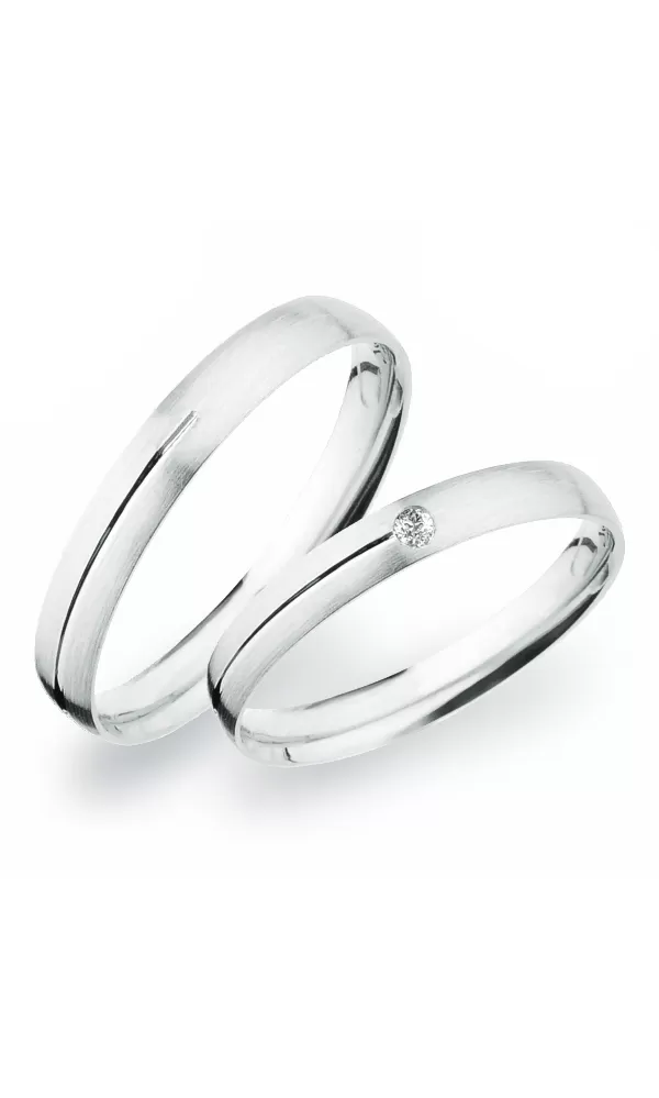 Snubní prsteny mírně půlkulatého profilu vyrobeny z bílého čtrnáctikarátového zlata 585/1000 s matnou povrchovou úpravou - sametový mat. Na prstenech je v polovině lesklá rýha vedená po půlce obvodu. Snubní prsteny mají vnitřní Fit Profil - půlkulatou vnitřní stranu pro příjemnější nošení. V dámském prstenu je vsazen jeden kulatý zirkon s briliantovým brusem Signity star, který dodává zirkonu maximální brilanci. Do snubních prstenů si můžete nechat vsadit také diamant. Kámen je vsazen do prstenu "na hladko". Vsazování zirkonů i diamantů provádějí naši nejzkušenější mistři zlatníci ručně pod mikroskopem s přesností na 0,01mm a proto nehrozí vypadnutí kamínků jako to bývá u strojně vyráběných snubních prstenů.Snubní prsteny je možné vyrobit v libovolných úpravách např. vyrobit snubní prsteny užší - nižší cena nebo širší - vyšší cena.