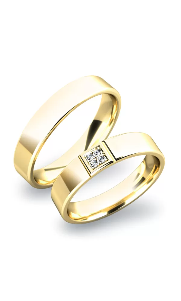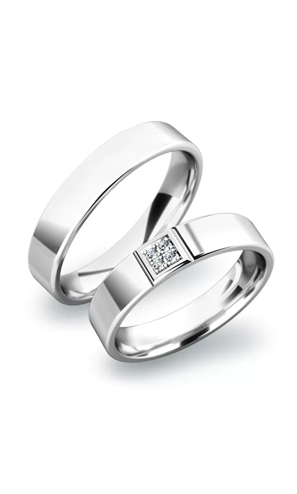 Nádherné snubní prsteny v rovném profilu jsou vyrobeny z bílého čtrnáctikarátového zlata 585/1000 v lesklé povrchové úpravě. Snubní prsteny mají vnitřní Fit Profil - půlkulatou vnitřní stranu pro příjemnější nošení, nasazování a sundavání. V dámském prstenu jsou vsazeny čtyři kulaté zirkony s briliantovým brusem Signity star, který dodává zirkonům oslnivou brilanci. Do snubních prstenů si můžete nechat vsadit také diamanty. Kameny jsou do prstenu vsazeny "do zrnek". Vsazování zirkonů i diamantů provádějí naši nejzkušenější mistři zlatníci ručně pod mikroskopem s přesností na 0,01mm a proto nehrozí vypadnutí kamínků jako to bývá u strojně vyráběných snubních prstenů.