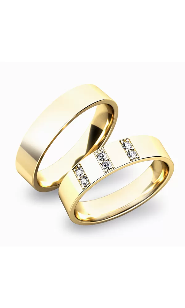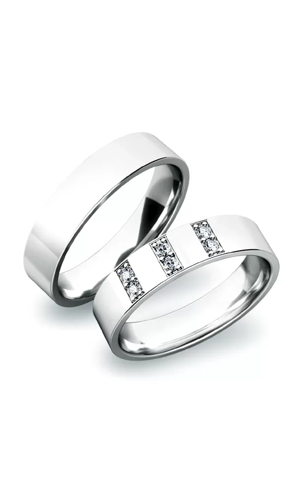 Krásné snubní prsteny v rovném profilu jsou vyrobeny z bílého čtrnáctikarátového zlata 585/1000 v lesklé povrchové úpravě. Snubní prsteny mají vnitřní Fit Profil - půlkulatou vnitřní stranu pro příjemnější nošení, nasazování a sundavání. V dámském prstenu je vsazeno šest kulatých zirkonů s briliantovým brusem Signity star, který dodává zirkonům oslnivou brilanci. Do snubních prstenů si můžete nechat vsadit také diamanty. Kameny jsou do prstenu vsazeny  "do krapniček". Vsazování zirkonů i diamantů provádějí naši nejzkušenější mistři zlatníci ručně pod mikroskopem s přesností na 0,01mm a proto nehrozí vypadnutí kamínků jako to bývá u strojně vyráběných snubních prstenů.