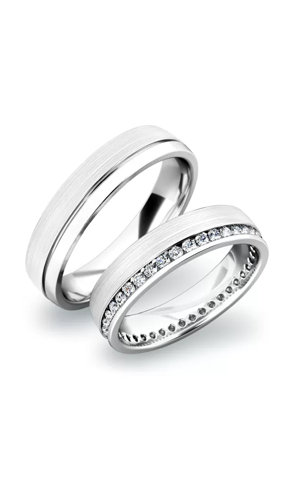 Luxusní snubní prsteny v mírně půlkulatém profilu jsou vyrobeny z bílého čtrnáctikarátového zlata 585/1000 v kombinaci lesklé a matné povrchové úpravy. Snubní prsteny mají vnitřní Fit Profil - půlkulatou vnitřní stranu pro příjemnější nošení, nasazování a sundavání. V dámském prstenu je vsazeno po celém obvodu čtyřicet kulatých zirkonů s briliantovým brusem Signity star, který dodává zirkonům oslnivou brilanci. Do snubních prstenů si můžete nechat vsadit také diamanty. Kameny jsou do prstenu vsazeny "na hladko - zatepáním". Vsazování zirkonů i diamantů provádějí naši nejzkušenější mistři zlatníci ručně pod mikroskopem s přesností na 0,01mm a proto nehrozí vypadnutí kamínků jako to bývá u strojně vyráběných snubních prstenů.