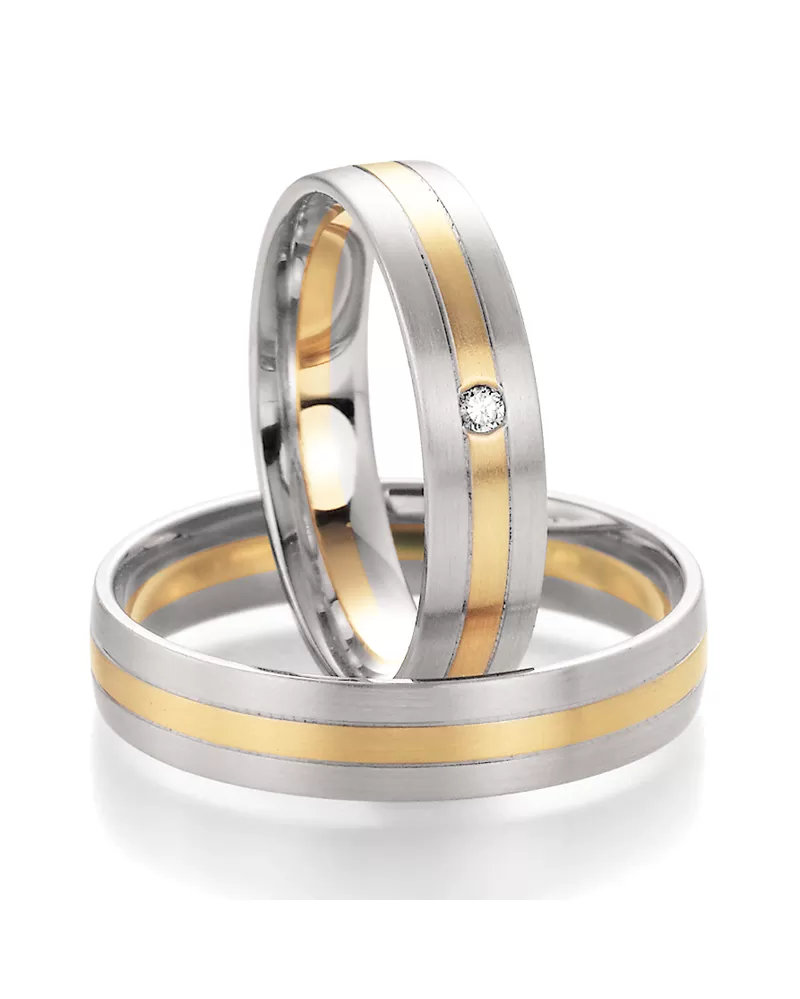Zlaté snubní prsteny vyrobeny v kombinaci  bílého a žlutého čtrnáctikarátového zlata - 585/1000 v rovném profilu v povrchové úpravě sametový mat. Střední žlutý pásek je oddělen jemnými rýhami. V dámském prstenu je vsazen jeden kulatý diamant briliantového brusu. Diamanty oplývají svou krásou a vlastnostmi, které jsou oproti jiným kamenům bezkonkurenční. Je to nejtvrdší nerost, který nikdy neztratí svou hodnotu. Diamant je král všech drahokamů a tedy i jedním z nejcennějších a proto se vyplatí do šperků s diamanty investovat a především u snubních prstenů, které jsou na celý život!  Vsazování diamantů provádějí naši nejzkušenější mistři zlatníci ručně pod mikroskopem s přesností na 0,01mm a proto nehrozí vypadnutí kamínků jako to bývá u strojně vyráběných snubních prstenů. Snubní prsteny mají vnitřní fit profil - zaoblení vnitřní strany prstenů.