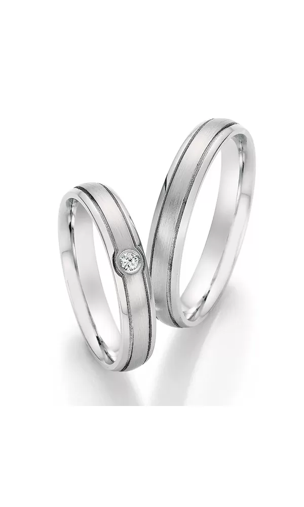 Elegantní snubní prsteny z chirurgické oceli v mírně půlkulatém profilu s kombinovanou povrchovou úpravou sametový mat – lesk. Kdy matný proužek uprostřed je zvýrazněn jemnými rýhami.