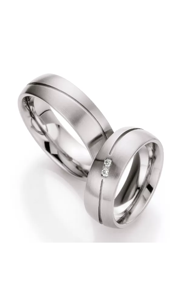 Široké snubní prsteny z chirurgické oceli půlkulatého profilu s dvěmi kulatými diamanty briliantového brusu v dámském prstenu. Diamanty vynikají svou krásou a vlastnostmi, které jsou oproti jiným kamenům bezkonkurenční. Je to nejtvrdší nerost, který nikdy neztratí svou hodnotu. Diamant je král všech drahokamů a tedy i jedním z nejcennějších a proto se vyplatí do šperků s diamanty investovat a především u snubních prstenů, které jsou na celý život! Vsazování diamantů provádějí naši nejzkušenější mistři zlatníci ručně pod mikroskopem s přesností na 0,01mm a proto nehrozí vypadnutí kamínků jako to bývá u strojně vyráběných snubních prstenů. Snubní prsteny mají vnitřní fit profil - zaoblení vnitřní strany prstenů pro příjemnější nošení, nasazování a sundavání prstenů.