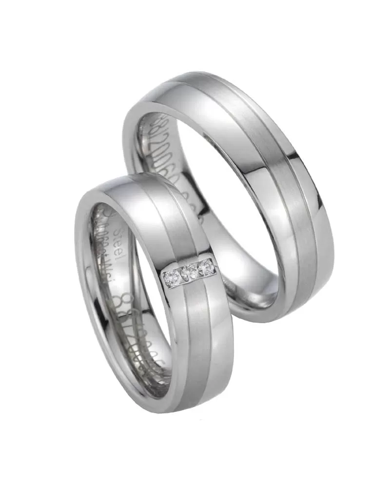 Elegantní snubní prsteny z chirurgické oceli v mírně půlkulatém profilu s matným šikmým pruhem v sametovém matu, který je oddělen a zvýrazněn jemnými rýhami. V dámském prstenu jsou vsazeny tři kulaté diamanty briliantového výbrusu. Diamanty vynikají svou krásou a vlastnostmi, které jsou oproti jiným kamenům bezkonkurenční. Je to nejtvrdší nerost, který nikdy neztratí svou hodnotu. Diamant je král všech drahokamů a tedy i jedním z nejcennějších a proto se vyplatí do šperků s diamanty investovat a především u snubních prstenů, které jsou na celý život! Vsazování diamantů provádějí naši nejzkušenější mistři zlatníci ručně pod mikroskopem s přesností na 0,01mm a proto nehrozí vypadnutí kamínků jako to bývá u strojně vyráběných snubních prstenů. Snubní prsteny mají vnitřní fit profil - zaoblení vnitřní strany prstenů pro příjemnější nošení, nasazování a sundavání prstenů.