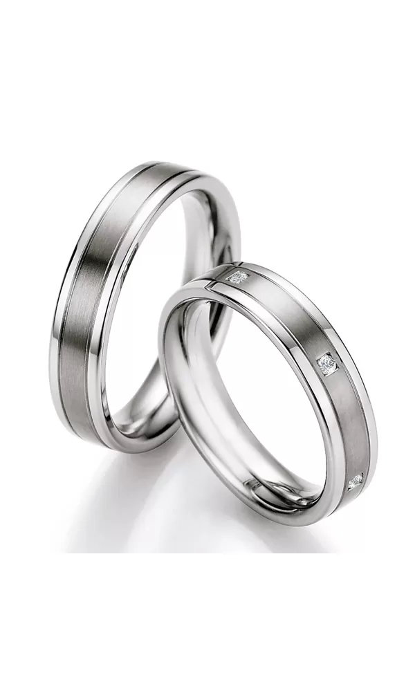 Ocelové snubní prsteny kombinované s titanem, kdy do snubního prstenu z chirurgické oceli je vložen titanový proužek. V dámském prstenu je vsazeno šest kulatých diamantů briliantového brusu po celém obvodu. Snubní prsteny jsou vyrobeny v rovném profilu s vnitřním fit profilem – zaoblení vnitřních stěn prstenů. Snubní prsteny jsou v kombinované povrchové úpravě sametový mat - lesk, kdy titanový proužek je zvýrazněn matováním a jemnými rýhami. Diamanty vynikají svou krásou a vlastnostmi, které jsou oproti jiným kamenům bezkonkurenční. Je to nejtvrdší nerost, který nikdy neztratí svou hodnotu. Diamant je král všech drahokamů a tedy i jedním z nejcennějších a proto se vyplatí do šperků s diamanty investovat a především u snubních prstenů, které jsou na celý život! Vsazování diamantů provádějí naši nejzkušenější mistři zlatníci ručně pod mikroskopem s přesností na 0,01mm a proto nehrozí vypadnutí kamínků jako to bývá u strojně vyráběných snubních prstenů. Snubní prsteny mají vnitřní fit profil - zaoblení vnitřní strany prstenů pro příjemnější nošení, nasazování a sundavání prstenů.