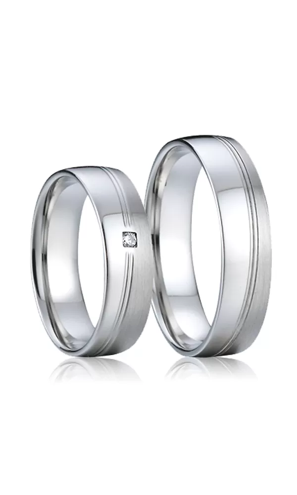 Ocelové snubní prsteny půlkulatého profilu s kombinovanou povrchovou úpravou lesk - sametový mat, který od sebe oddělují dvě jemné rýhy. V dámském prstenu je vsazen do čtverečku jeden kulatý zirkon s briliantovým brusem Signity star, který dodává zirkonům maximální brilanci. Prsteny mají vnitřní fit profil - zaoblenou vnitřní stranu pro příjemnější nošení, nasazování a sundavání.