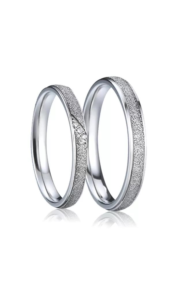Úzké ocelové snubní prsteny mírně půlkulatého profilu s povrchovou úpravou diamantový mat a lesklé snížené kraje. V dámském prstenu jsou vsazeny tři kulaté zirkony  s briliantovým brusem Signity star, který dodává zirkonům maximální brilanci. Prsteny mají vnitřní fit profil - zaoblenou vnitřní stranu pro příjemnější nošení, nasazování a sundavání.