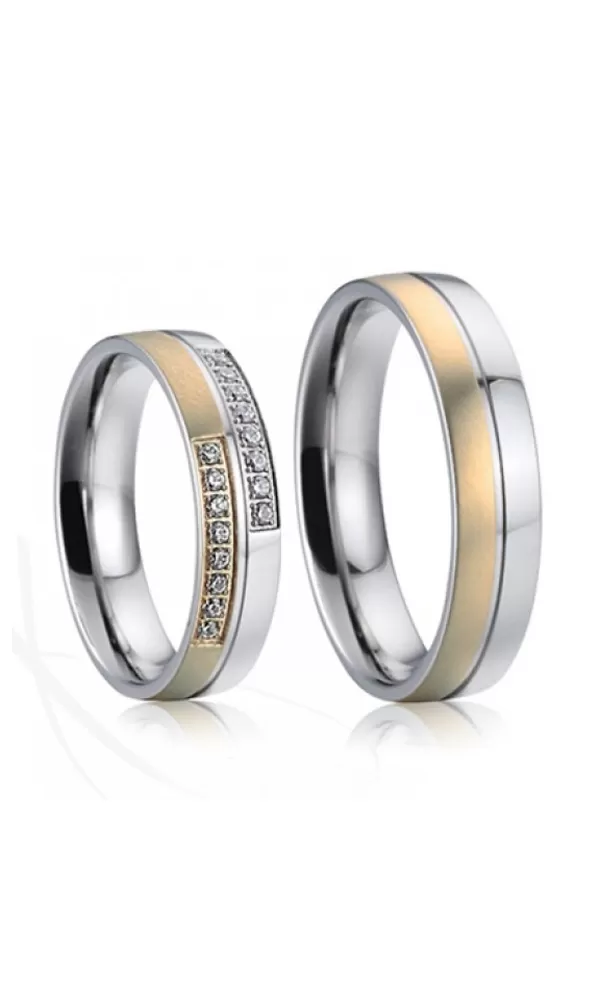 Krásné ocelové snubní prsteny mírně půlkulatého profilu s kombinovanou povrchovou úpravou lesk - sametový mat. Polovina je matná s PVD zlacením a polovina je lesklá, uprostřed odděleno jemnou rýhou. V dámském prstenu je vsazeno ve dvou řadách 16 kulatých zirkonů s briliantovým brusem Signity star, který dodává zirkonům maximální brilanci. Prsteny mají vnitřní fit profil - zaoblenou vnitřní stranu pro příjemnější nošení, nasazování a sundavání.