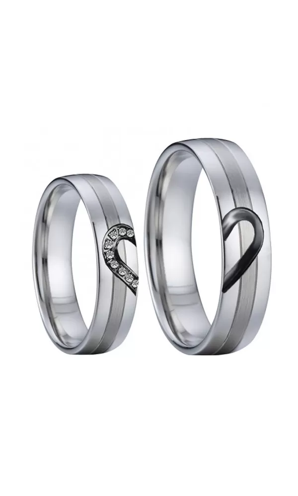 Elegantní ocelové snubní prsteny mírně půlkulatého profilu s kombinovanou povrchovou úpravou lesk x mat. Kraje prstenu jsou ve vysokém lesku, prostřední pruh je v sametovém matu a je oddělen jemnými rýhami. Na pánském prstenu je kontura srdíčka černá a v dámském prstenu je vsazeno 9 ks kulatých zirkonů s briliantovým brusem Signity star, který dodává zirkonům maximální brilanci. Prsteny mají vnitřní fit profil  - zaoblenou vnitřní stranu pro příjemnější nošení, nasazování a sundavání.