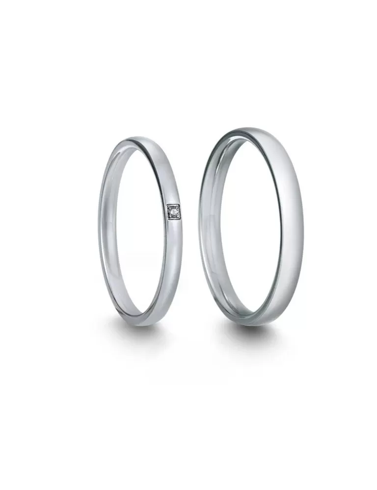 Moderní snubní prsteny mírně půlkulatého profilu jsou vyrobeny z chirurgické oceli v lesklé povrchové úpravě. Dámský prsten zdobí jeden ručně vsazený zirkon. Zirkon je vybroušen briliantovým brusem Signity star, který dodává zirkonu maximální brilanci. Pánský prsten je v hladký a v lesku. Snubní prsteny mají vnitřní Fit Profil – půlkulatou vnitřní stranu pro příjemnější nošení, nasazování a sundávání.
