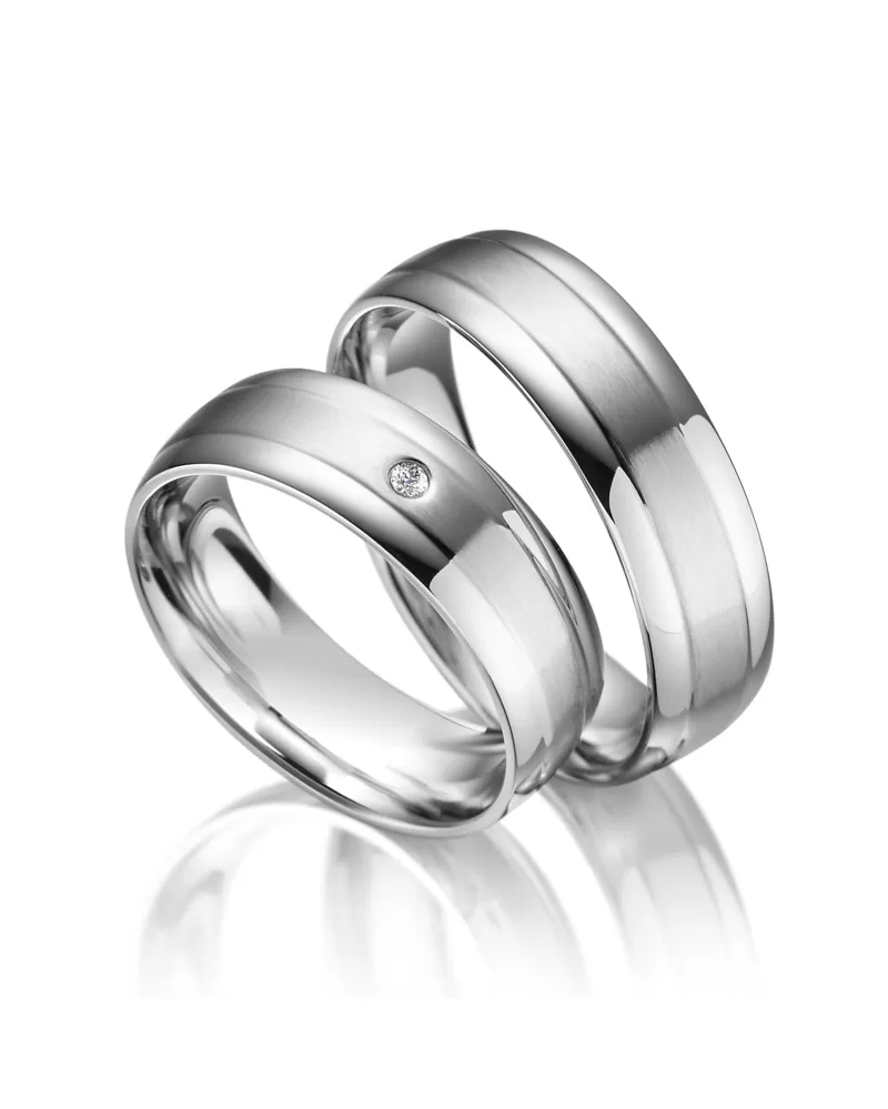 Moderní ocelové snubní prsteny mírně půlkulatého profilu po krajích a s rovným středem. Prsteny zdobí kombinovaná povrchová úprava lesk - sametový mat, kdy lesklé jsou kraje a matný je střed prstenu. V dámském prstenu je vsazen jeden zářivý kulatý zirkon s briliantovým brusem Signity star, který dodává zirkonu maximální brilanci. Prsteny mají vnitřní fit profil - zaoblenou vnitřní stranu pro příjemnější nošení, nasazování a sundavání.