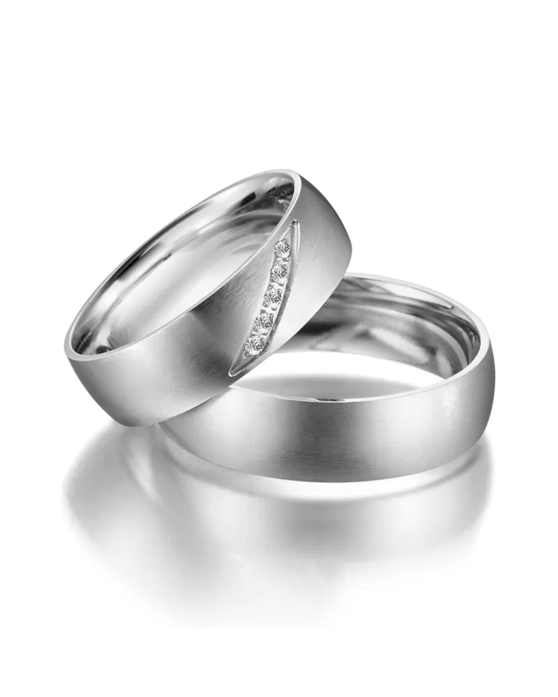 Moderní ocelové snubní prsteny mírně půlkulatého profilu s matnou povrchovou úpravou. Dámský prsten je zdoben pěti zářivými zirkony s briliantovým brusem Signity star, který dodává zirkonům maximální brilanci. Prsteny mají vnitřní fit profil - zaoblenou vnitřní stranu pro příjemnější nošení, nasazování a sundavání.
