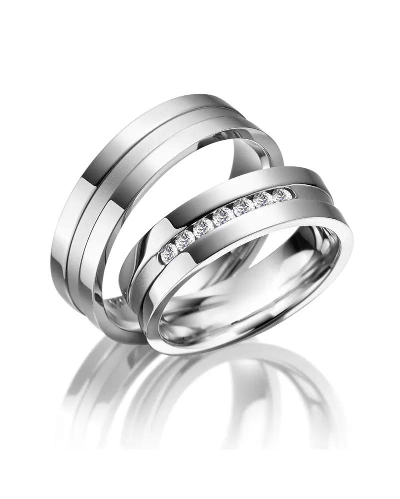 Ocelové snubní prsteny rovného profilu v lesklé povrchové úpravě s matnou drážkou, která je zdobena pískováním. Drážka u dámského prstenu je lemována sedmi kulatými zářivými zirkony s briliantovým brusem Signity star, který dodává zirkonům maximální brilanci. Prsteny mají vnitřní fit profil - zaoblenou vnitřní stranu pro příjemnější nošení, nasazování a sundavání.
