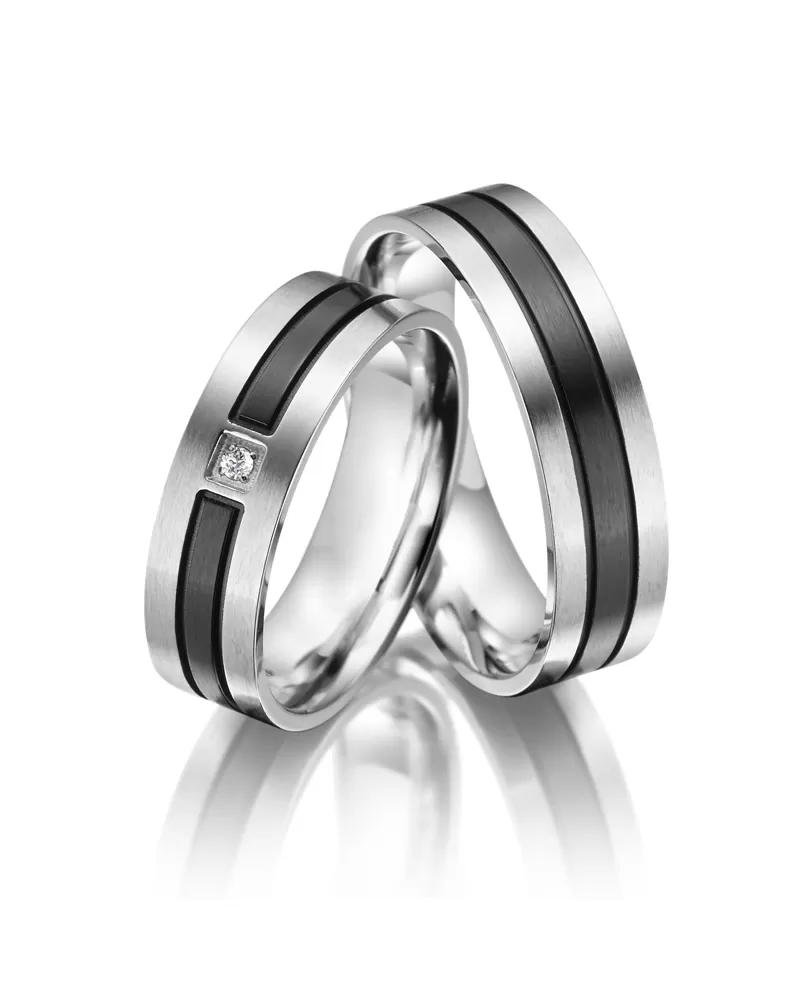 Ocelové snubní prsteny rovného profilu v matné povrchové úpravě. Prsteny se skládají ze tří pruhů, kdy prostřední část je černou barvou technologií PVD. Tato část je u dámského prstenu rozdělena jedním zářivým zirkonem o velikosti 1,50 mm s briliantovým brusem Signity star, který dodává zirkonu maximální brilanci. Prsteny mají vnitřní fit profil - zaoblenou vnitřní stranu pro příjemnější nošení, nasazování a sundavání.