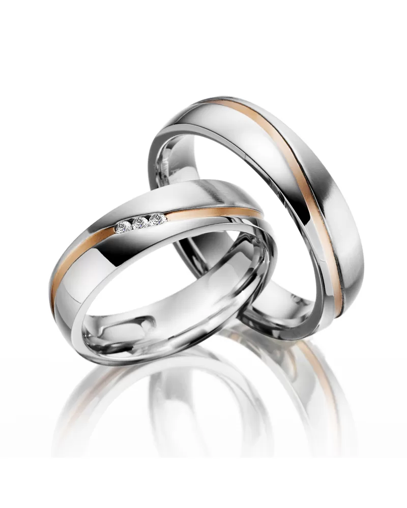 Ocelové snubní prsteny mírně půlkulatého profilu v kombinaci lesklé a matné povrchové úpravy, které jsou od sebe rozděleny matnou pozlacenou vlnkou, která je zlacená technologií PVD .V dámském prstenu jsou ve vlnce vsazeny tři kulaté zirkony o velikosti 1,50 mm s briliantovým brusem Signity star, který dodává zirkonům maximální brilanci. Prsteny mají vnitřní fit profil - zaoblenou vnitřní stranu pro příjemnější nošení. Prsteny mají vnitřní fit profil - zaoblenou vnitřní stranu pro příjemnější nošení, nasazování a sundavání.