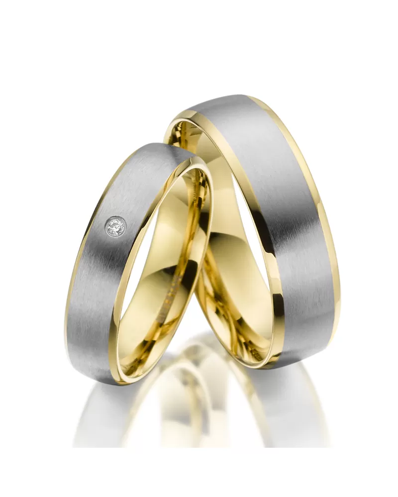 V jednoduchosti je krása! Ocelové snubní prsteny mírně půlkulatého profilu s kombinovanou povrchovou úpravou vysoký lesk a mat. Navíc jsou prsteny zlacené technologií PVD v barvě žlutého zlata. Kraje prstenu jsou mírně zkosené, zlacené a v lesku. Prostřední část je v nádherném sametovém matu. Dámský prsten je osazený v matné části jedním zářivým zirkonem s briliantovým brusem Signity star, který dodává zirkonu maximální brilanci. Prsteny mají vnitřní fit profil - zaoblenou vnitřní stranu pro příjemnější nošení, nasazování a sundavání.