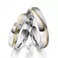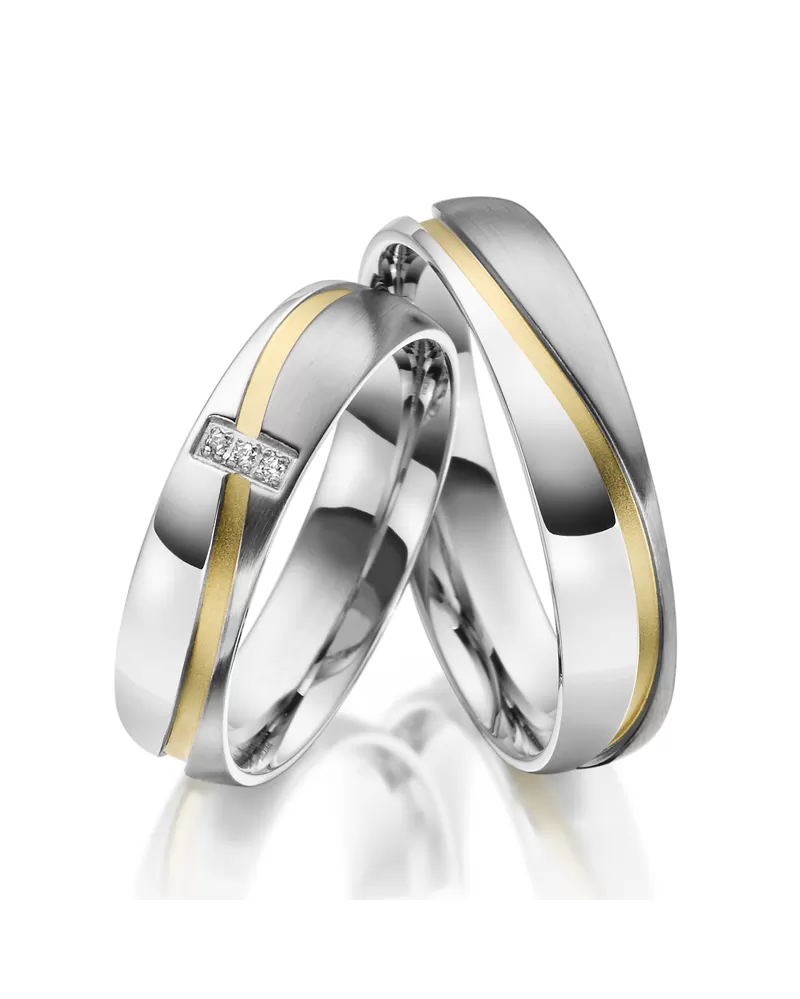 Moderní dvoubarevné provedení! Ocelové snubní prsteny mírně půlkulatého profilu s kombinovanou povrchovou úpravou lesk a mat. Prsten je rozdělený na dvě části, kdy je jedna lesklá a druhá v sametovém matu. Tyto dvě části rozděluje krásně zakroucená matná vlnka, která je navíc zlacená technologií PVD v barvě žlutého zlata. U dámského prstenu jsou vsazeny tři zářivé zirkony s briliantovým brusem Signity star, který dodává zirkonům maximální brilanci. Prsteny mají vnitřní fit profil - zaoblenou vnitřní stranu pro příjemnější nošení, nasazování a sundavání.