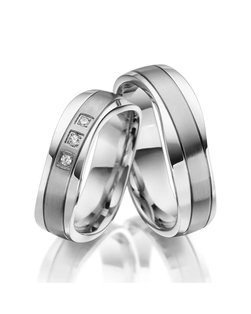 Atypické ocelové snubní prsteny rovného profilu s kombinovanou povrchovou úpravou lesk a mat. Prsten je tvarově atypicky zakroucený. Kraje má lesklé a uprostřed je dominantní vodorovná část, které je v sametovém matu. U dámského prstenu jsou tři zářivé zirkony, které jsou vsazené do čtverečku. Zirkony jsou vybroušeny briliantovým brusem Signity star, který dodává zirkonům maximální brilanci. Prsteny mají vnitřní fit profil - zaoblenou vnitřní stranu pro příjemnější nošení, nasazování a sundavání.
