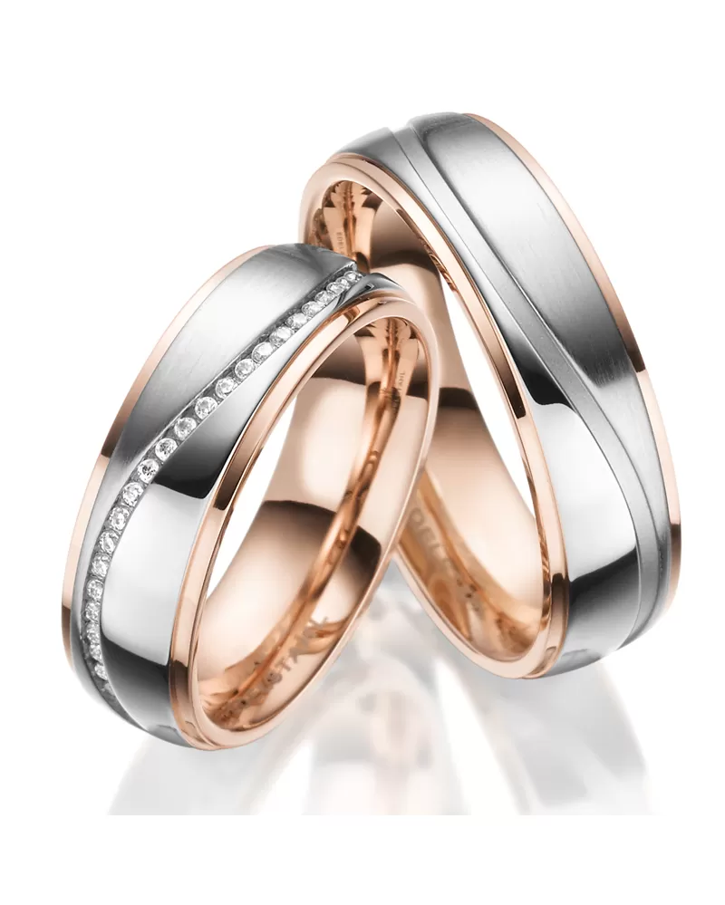 Model těchto snubních prstenů zaujme zlacenými proužky po stranách a vnitřními plochy prstenů. Snubními prsteny vede snížená vlnka zvýrazněná hrubší povrchovou úpravou, která se nazývá pískování. Tato vlnka, rozděluje, u pánského prstenu lesknou část a část, která je zdobená sametovým matem. Dámský prsten má ve snížené vlnce vsazeny zirkony. Zirkony jsou v briliantovém brusu Signity star, který dodává zirkonům maximální brilanci. Snubní prsteny mají vnitřní Fit Profil – půlkulatou vnitřní stranu pro příjemnější nošení, nasazování a sundávání.