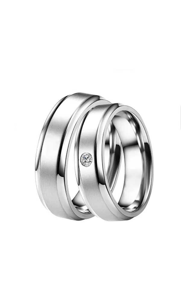 Snubní prsteny z chirurgické oceli v mírně půlkulatém profilu s kombinovanou povrchovou úpravou sametový mat – lesk.  V dámském prstenu je vsazen jeden kulatý zirkon s briliantovým brusem Signity star, který dodává zirkonům maximální brilanci. Prsteny mají vnitřní fit profil - zaoblenou vnitřní stranu pro příjemnější nošení, nasazování a sundavání.