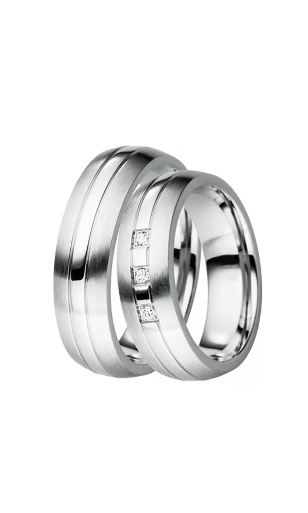 Snubní prsteny z chirurgické oceli v mírně půlkulatém profilu s kombinovanou povrchovou úpravou lesk - sametový mat, kdy je lesklá část uprostřed oddělena jemnými rýhami.  V dámském prstenu jsou vsazeny do čtverečku tři kulaté zirkony s briliantovým brusem Signity star, který dodává zirkonům maximální brilanci. Prsteny mají vnitřní fit profil - zaoblenou vnitřní stranu pro příjemnější nošení, nasazování a sundavání.