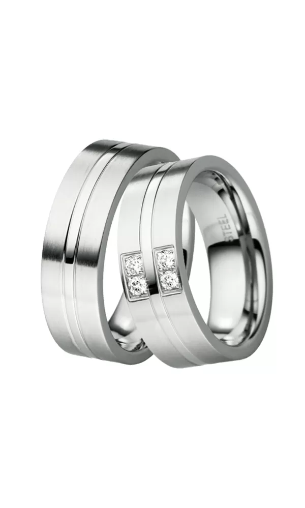 Snubní prsteny z chirurgické oceli v mírně půlkulatém profilu s kombinovanou povrchovou úpravou lesk - sametový mat, kdy je lesklá část uprostřed oddělena jemnými rýhami.  V dámském prstenu jsou vsazeny do čtverečku čtyři kulaté zirkony s briliantovým brusem Signity star, který dodává zirkonům maximální brilanci. Prsteny mají vnitřní fit profil - zaoblenou vnitřní stranu pro příjemnější nošení, nasazování a sundavání.