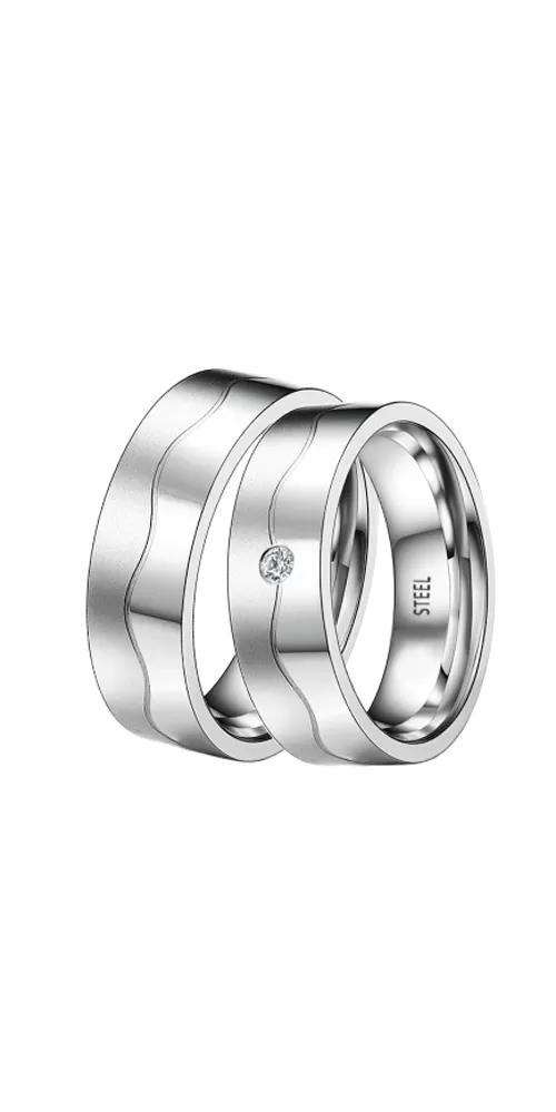 Snubní prsteny z chirurgické oceli v mírně půlkulatém profilu s kombinovanou povrchovou úpravou lesk - sametový mat, kdy je lesklý proužek oddělen vlnovkou uprostřed. V dámském prstenu je vsazen jeden kulatý zirkon s briliantovým brusem Signity star, který dodává zirkonům maximální brilanci. Prsteny mají vnitřní fit profil - zaoblenou vnitřní stranu pro příjemnější nošení, nasazování a sundavání.