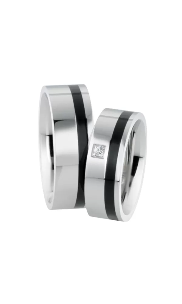 Snubní prsteny z chirurgické oceli v mírně půlkulatém profilu s lesklou povrchovou úpravou. Prsteny mají po obvodu černý proužek.  V dámském prstenu je vsazen do čtverečků jeden kulatý zirkon s briliantovým brusem Signity star, který dodává zirkonům maximální brilanci. Prsteny mají vnitřní fit profil - zaoblenou vnitřní stranu pro příjemnější nošení, nasazování a sundavání.