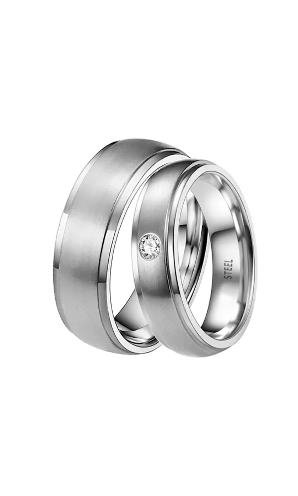 Snubní prsteny z chirurgické oceli v mírně půlkulatém profilu s kombinovanou povrchovou úpravou sametový mat – lesk.  V dámském prstenu je vsazen jeden kulatý zirkon  s briliantovým brusem Signity star, který dodává zirkonům maximální brilanci. Prsteny mají vnitřní fit profil - zaoblenou vnitřní stranu pro příjemnější nošení, nasazování a sundavání.