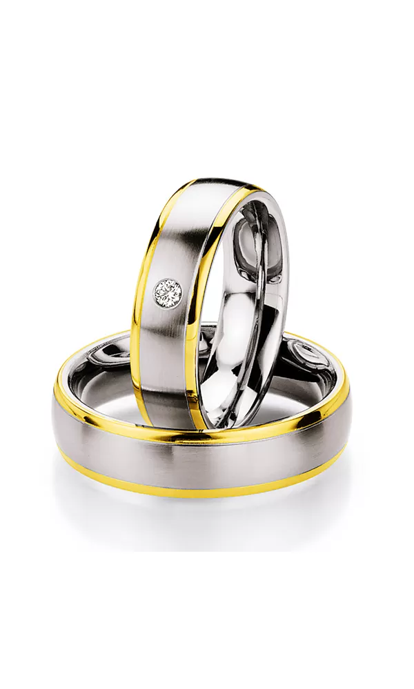 Ocelové snubní prsteny v kombinaci se žlutým zlatem 585/1000 = 14 karátů v půlkulatém profilu s kombinovanou povrchovou úpravou sametový mat - lesk, kdy střední část je sametově matná a zlaté proužky lesklé. V dámském prstenu je vsazen jeden kulatý diamant briliantového brusu. Snubní prsteny mají vnitřní fit profil - zaoblení vnitřní strany prstenů. Diamanty vynikají svou krásou a vlastnostmi, které jsou oproti jiným kamenům bezkonkurenční. Je to nejtvrdší nerost, který nikdy neztratí svou hodnotu. Diamant je král všech drahokamů a tedy i jedním z nejcennějších a proto se vyplatí do šperků s diamanty investovat a především u snubních prstenů, které jsou na celý život! Vsazování diamantů provádějí naši nejzkušenější mistři zlatníci ručně pod mikroskopem s přesností na 0,01mm a proto nehrozí vypadnutí kamínků jako to bývá u strojně vyráběných snubních prstenů. Snubní prsteny mají vnitřní fit profil - zaoblení vnitřní strany prstenů pro příjemnější nošení, nasazování a sundavání prstenů.